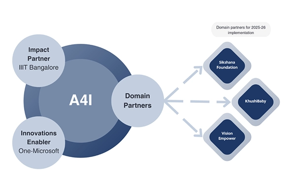 The AI Innovation and Inclusion Initiative (A4I) is a collaboration between Microsoft as innovation enablers, and IIIT-Bangalore as the impact partner. The initiative combines Microsoft’s cutting-edge AI capabilities and innovations with IIIT-B’s expertise in research, solution-scaling and field-driven deployment to transform proven innovations into scalable Digital Public Goods (DPGs). A4I provides a structured framework for governance, partnerships, and scale, enabling high-impact AI solutions to reach underserved communities effectively.